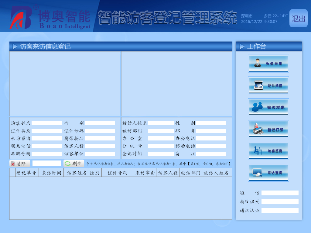? ? ??為了進一步加強居住、辦公,學校等場合的安全化管理,同時適應信息化條件下的無紙化辦公、自動化辦公以及訪客信息的長期有效保存、即時查詢等,因此智能訪客管理系統就成為了各企業事業單位迫切需要的自動化和智能化訪客管理的必需設備; 在此實際應用需求的基礎上,博奧智能公司自主研發一套更加科學,先進、完善、高效、智能信息化的訪客登記定位管理系統來保障居住、辦公,學校等場合的安全,嚴格控制和管理人員出入及進入場所范圍定位和行動軌跡;智能訪客定位管理系統通過對來訪人員的各種證件進行掃描識別采集上傳,指紋采集比對,并和公安局所提供接口進行對接,自動進行實時比對,判斷是否在逃嫌疑人員;利用攝像機對來訪人員拍照,打印進門憑條,發放臨時進門卡等方式,對來訪人員進入場所進行定位和實時軌跡跟蹤。