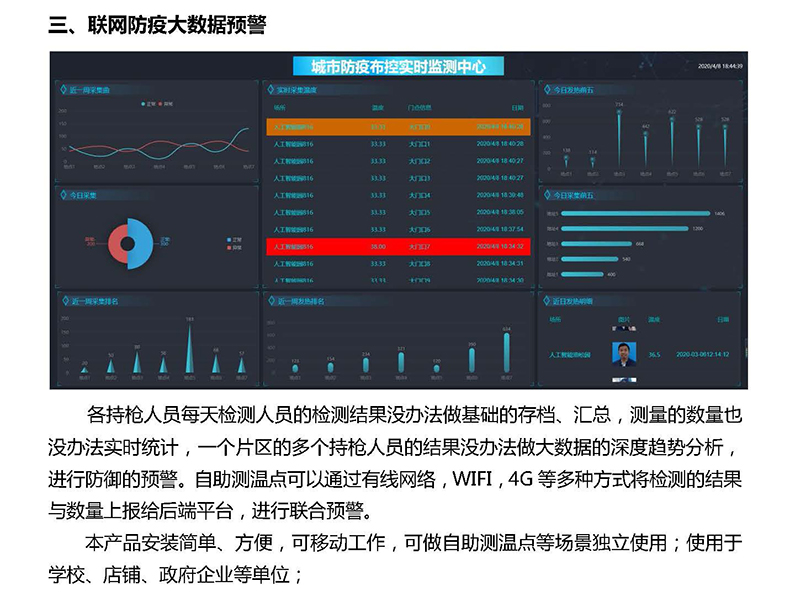 7. 支持有線網絡/WIFI/4G聯網到防疫指揮中心平臺及第三方平臺;