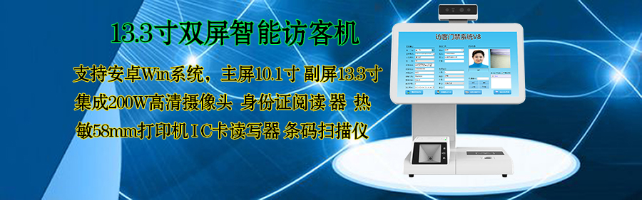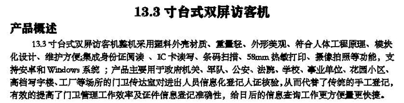 13.3寸臺式雙屏訪客機整機采用塑料外殼材質、重量輕、外形美觀、符合人體工程原理、模塊化設計、維護方便;集成身份證閱讀 、IC卡讀寫、條碼掃描、58mm熱敏打印、攝像拍照等功能,支持安卓和Windows系統 ;產品主要用于政府機關、軍隊、公安、法院、學校、事業單位、花園小區、高檔寫字樓、工廠等場所的門衛傳達室對進出人員信息化登記人證核驗,從而代替了傳統的手工登記,有效的提高了門衛管理工作效率及證件信息登記準確性,給日后的信息查詢工作更方便量更快捷。