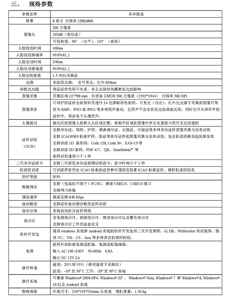 6) 高清拍攝,清晰視角:證件識別攝像頭500萬像素高清成像,物理分辨率達到500DPI;可見光采集圖像、紅外光識別;