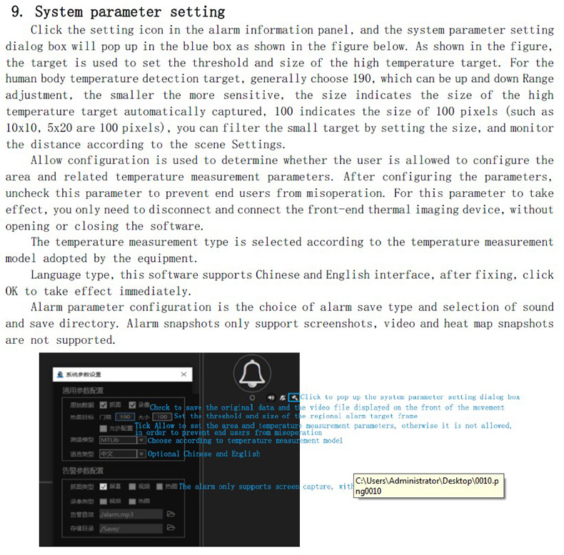 告警參數配置是報警保存類型的選擇及聲音和保存目錄的選擇。報警抓圖只支持屏幕截圖,錄像和熱圖抓拍不支持。