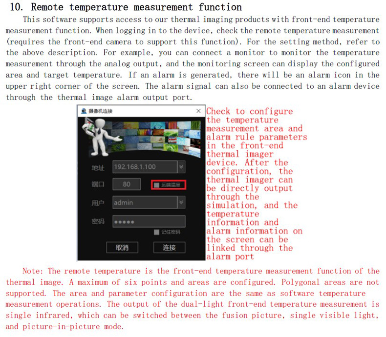 注:遠端溫度就是熱像前端測溫功能,最多配置總共六個點和區域,不支持多邊形區域,區域和參數配置和軟件測溫操作一樣。雙光前端測溫的輸出是單紅外,融合畫面、單可見光、畫中畫模式可切換的。