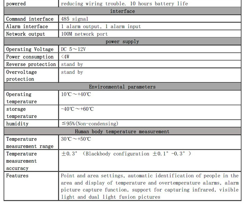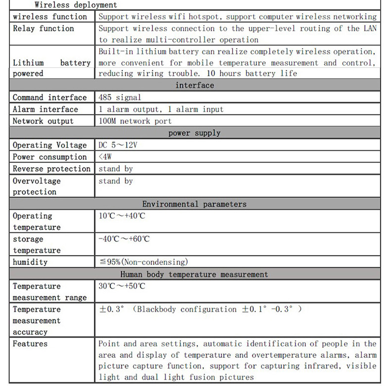 內置鋰電池,可實現完全無線操作,更方便移動測溫布控,減少布線麻煩。電池續電時間10個小時 |
