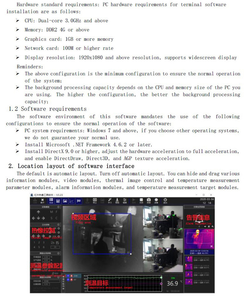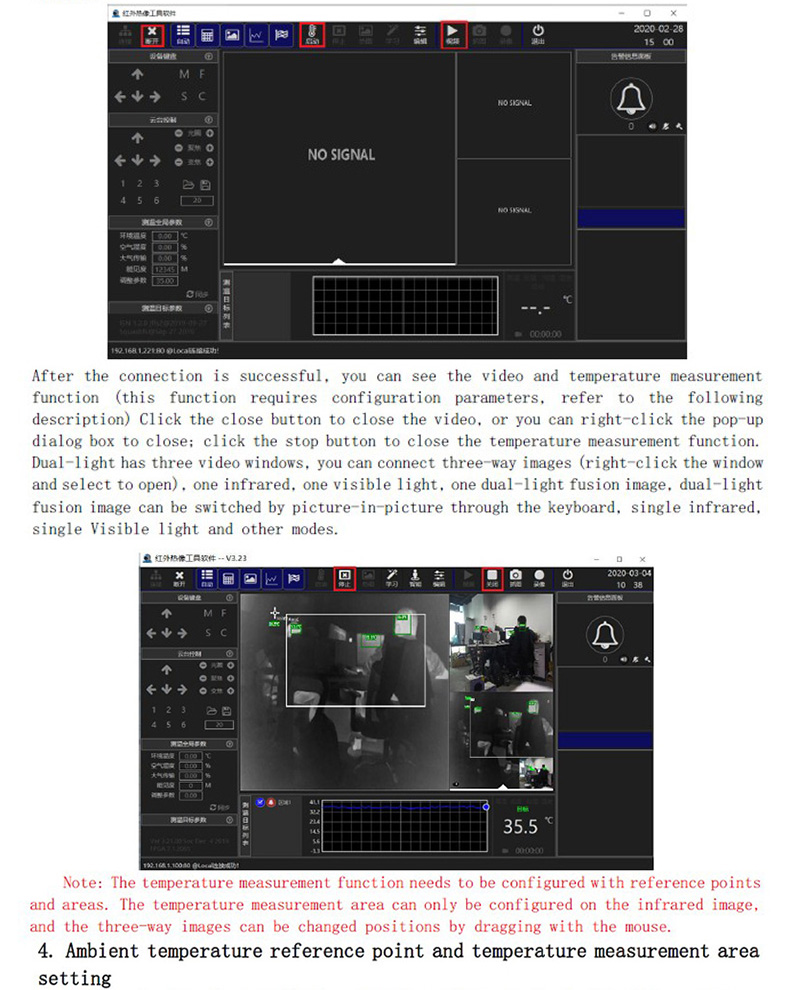 ??? 雙光模組通過網絡圖傳連接PC,PC端安裝測溫軟件,該軟件可以連接熱像和可見光視頻,可以設置點和區域測溫,區域內可自動追蹤人員并顯示溫度,可配置超溫報警,實現報警抓拍功能。