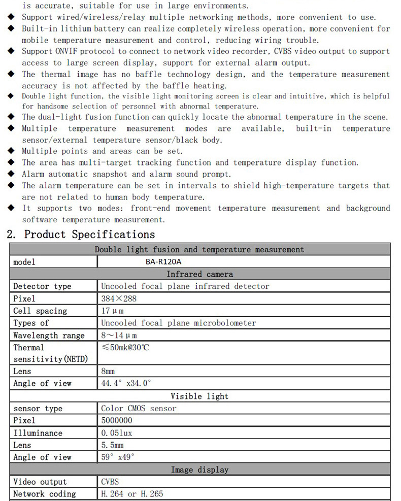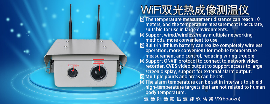 無線雙光融合人體高精度測溫儀,具有雙光融合功能,可快速準確地分辨溫度異常人員,可輸出無線/有線網絡信號,配合后臺PC測溫軟件,可實現非接觸快速大流量人體溫度異常篩選功能,采用最新智能測溫模型,無擋片成像方式,可以連續不間斷對目標人群進行溫度檢測,測溫精度可達±0.3°(配置黑體可達±0.1°-0.3°)。
