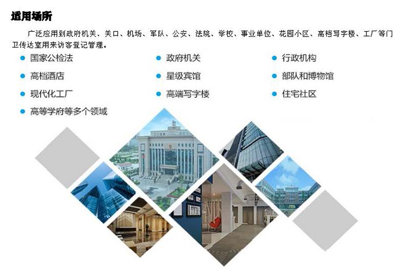 1、刷身份證(二代/三代證)自動讀取信息, 2、現場拍照人像采集并保存。支持人證比對 3、來訪單位、來訪事由、車輛、攜帶物品等信息登記 。 4、被訪人信息登記:(1)被訪人姓名模糊查詢,輸入姓名的第一個字、或首字母、手機號、電話號碼、模糊查詢,系統自動帶出相應的被訪人信息;(2)選擇被訪對象,多人來訪快速登記; 5、IC常訪卡快速登記;來訪預約登記管理。 6、提醒功能:身份證真假識別、黑名單提醒、VIP訪客提醒; 當日訪客人數、訪客離開人數、未離開人數自動顯示;訪客離開/未離開記錄區別顯示;常訪卡有效期提醒、離開未登記提醒、訪客來訪歷史提醒。 7、打印訪客單或發放IC卡,身份證,二維碼;登記數據保存到數據庫 8、★支持多臺聯網,人證比對,刷卡抓拍,查看前后10秒錄像,實時監控查看 9、支持訪客信息臨時保存,等需要時,再快速顯示。 10、支持訪客及被訪人短信通知,可更改通知內容模板 11、★微信預約界面可以自定義字段,最多可設置20個字段,功能,微信審核功能,微信查詢預約記錄(微信預約功能需要單獨購買公眾號預約平臺)。 12、★可以網頁查詢微信預約記錄,可以導出記錄 13、★可以網頁導入微信被訪人員工信息 14、★可添加海康錄像機,查看錄像及照片,現場情況一目了然 15、★可自行添加掃描的證件類型號,共有79種證件可以快速識別錄入,不需要手工輸入,效率超快。 16、★查詢統計導出界面的字段,可以自行添加刪除,把你用不上的字段可以直接移除。 17、★可以批量導入被訪人信息,批量添加內部人員權限到門禁 18、★觸屏輸入法,可以輸入中文,字母,數字,手寫,英文(非系統自帶鍵盤,采用蘋果風格,讓輸入更清松) 19、★可以自定義界面風格圖,LOGO,標題 20、登記時,提示第幾次來訪 21、登記界面,可以多個攝像頭之間切換 22、電話自動撥號(需購買撥號器) 23、刷身份證自動比對人臉 24、二維碼讀頭支持掃微信預約二維碼 |