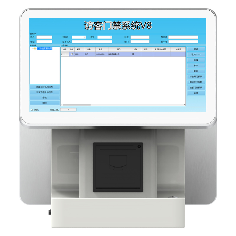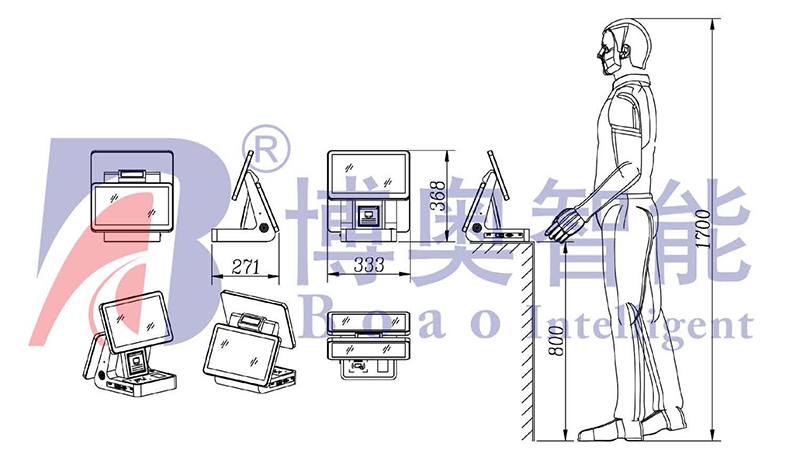 BA-FK13A訪客機是博奧智能針對政府機關、軍隊、公安、法院、學校、事業單位、花園小區、高檔寫字樓、工廠等門衛傳達室設計加工的一款進出人員信息化登記設備, 從而代替了傳統的手工登記,有效的提高了門衛管理工作效率及證件信息登記準確性, 為日后的信息查詢工作更方便量更快捷。整機采用流線性設計,符合人體工程原理,結構合理,外形美觀大方,操作簡單,維護方便;內部采用模塊化設計,集成13.3寸電容觸顯一體屏和13.3寸液晶屏、身份證閱讀器,IC卡讀寫器、雙目寬動態高清攝像頭、條碼掃描儀、熱敏打印機及熱成像測溫等模塊。