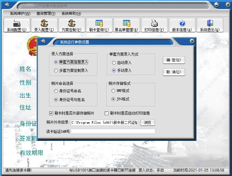 上述設置,應在正式二代證讀卡錄入前設置好,錄入參數一經設置,可立刻生效。