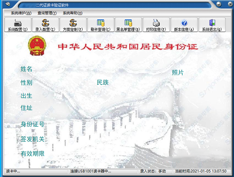 《二代身份證讀卡驗證軟件》是與二代身份證閱讀器相配套的讀卡軟件,其安裝在預裝window操作系統的計算機上,通過串口或USB口與相應的二代身份證閱讀器連接,可以讀取、顯示并存儲二代身份證的信息,主要信息有姓名、性別、出生日期、身份證號、住址、證件有效期限、證件簽發機關、照片等等,并提供支持二代證信息的查詢、打印、統計與輸出,還可以把讀取的二代證信息錄入到相關的應用程序中,實現與相關應用系統的無縫對接。