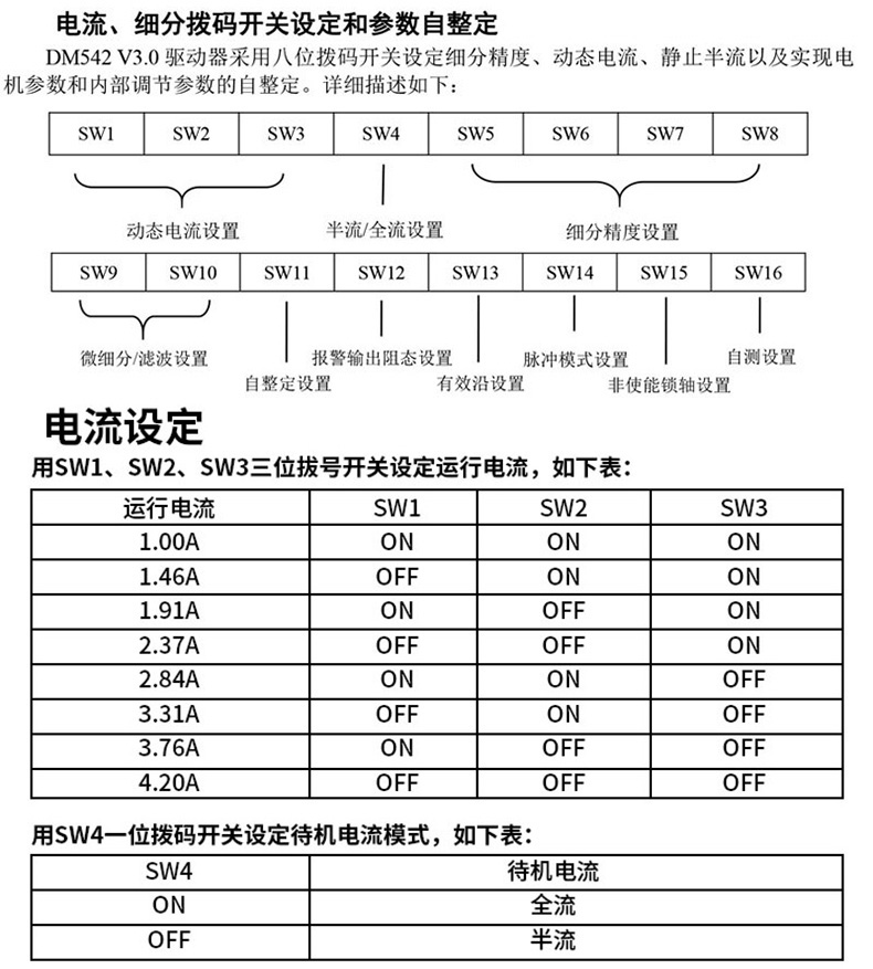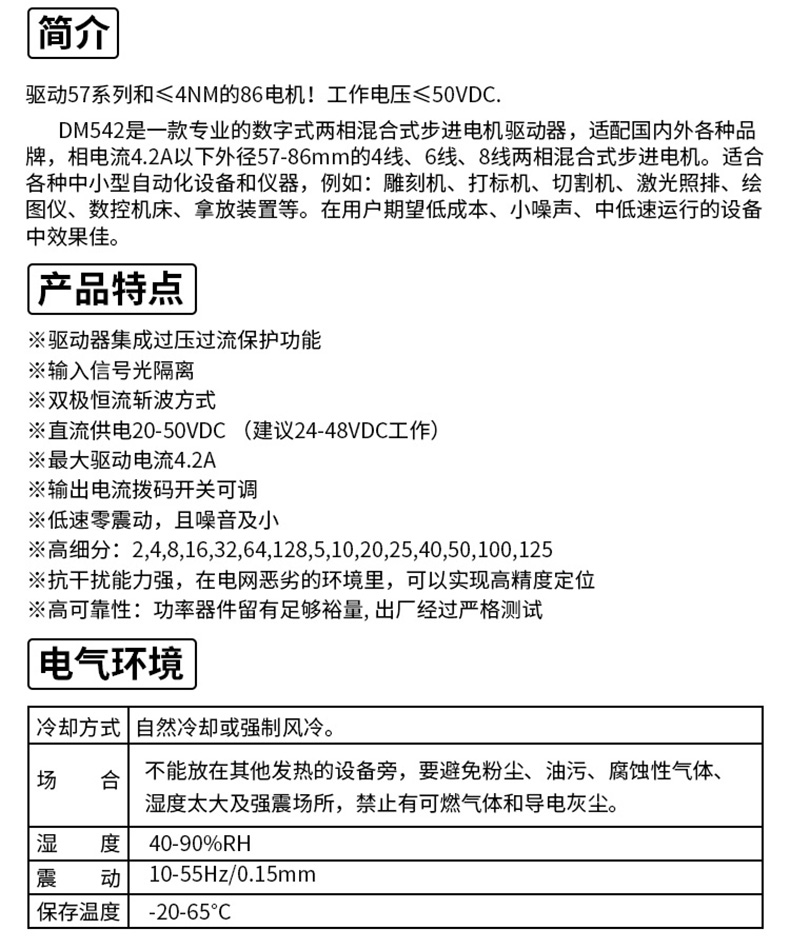 DM542 DSP 控制的數字式兩相混合式步進電機驅動器,適配相電流在 4.2A 以下、外徑 39,42,57,60,86mm 的四線,六線,八線兩相混合式步進電機。可設置128 內各種細分以及 4.2A 內各種電流,內部增加電機專用控制算法,能夠針對不同電機采用相應運行參數,使電機運行非常平穩,震動以及噪聲極小。 內置過熱,過流,過壓檢測,保護驅動器穩定運行。
