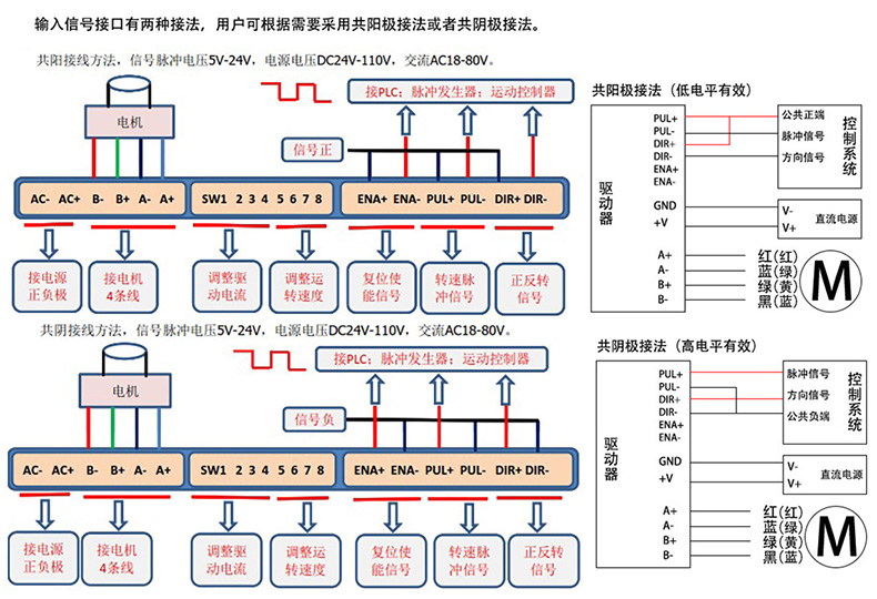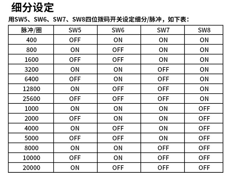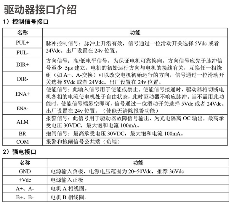 使能控制信號 此輸入信號用于使能或禁止驅動器輸出。ENA 接低電平(或內部光耦導通)時,驅動器將切斷電機各相的電流使電機處于自由狀態, 不響應步進脈沖。當不需用此功能時,使能信號端懸空即可。5-24VDC 電平兼容。 |