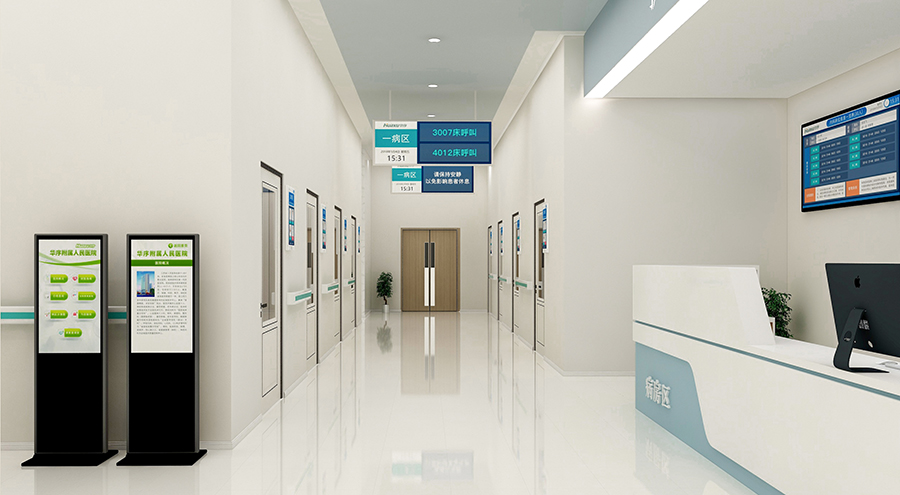 分診區域包括醫院不同科室的樓層入口、分診臺、走廊、休息等候區等區域,可以架設顯示屏幕,播放樓層科室布局介紹、分診信息、排隊叫號信息、醫院通知等內容。