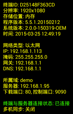 BA-iDS6終端軟件內置安裝在安卓主板上,主板開機后自動運行終端程序進入播放狀態。按遙控器的INFO鍵,或快速點擊屏幕任意一個角落四次,可呼出如下圖所示的終端運行狀態信息,包括終端ID、分辨率、節目存儲位置、播放程序版本、安卓系統版本、機器時間、網絡參數、服務器參數、終端到服務器的連接狀態、多級同步開關等信息。
