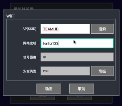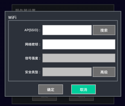 WiFi配置如下面圖片所示,可通過WiFi配置界面的搜索按鈕打開手動搜索界面,通過刷新按鈕更新無線AP列表,并在搜索結果列表中選擇合適的AP名稱(AP名稱也可以自行手動直接輸入),同時輸入相應的網絡密鑰即可完成WiFi的設置。如果某些AP不支持DHCP動態分配IP地址或者網絡環境不允許使用動態IP地址,則可通過高級按鈕進入手動設置IP地址界面(設置界面完全類似以太網的手動設置IP地址界面)。