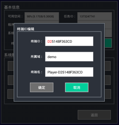 終端基本信息中的[設置]按鈕彈出界面如下圖所示,可進行終端ID、所屬域、終端名稱的編輯。終端所屬域定義了終端在服務器的在哪個域中可見,如果為空則默認為demo域。請注意:如果服務器強制將終端錄入到了某個域,則終端一旦聯網就會自動轉換到相應的域