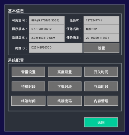 終端系統配置功能中包括音量設置、亮度設置、開關時間、待機時段、下載時段、互動時段、終端時間、終端密碼、內容管理等。