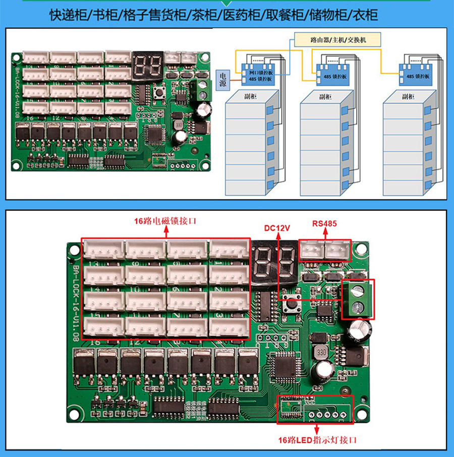 鎖控板廣泛應用于智能快遞柜、格子售貨柜、口紅柜、儲物柜、設備售書機、信報箱、寄存柜、物流柜、文件柜、電表箱、更衣柜、自動售販機、手機柜、鞋柜等集中控制箱柜。