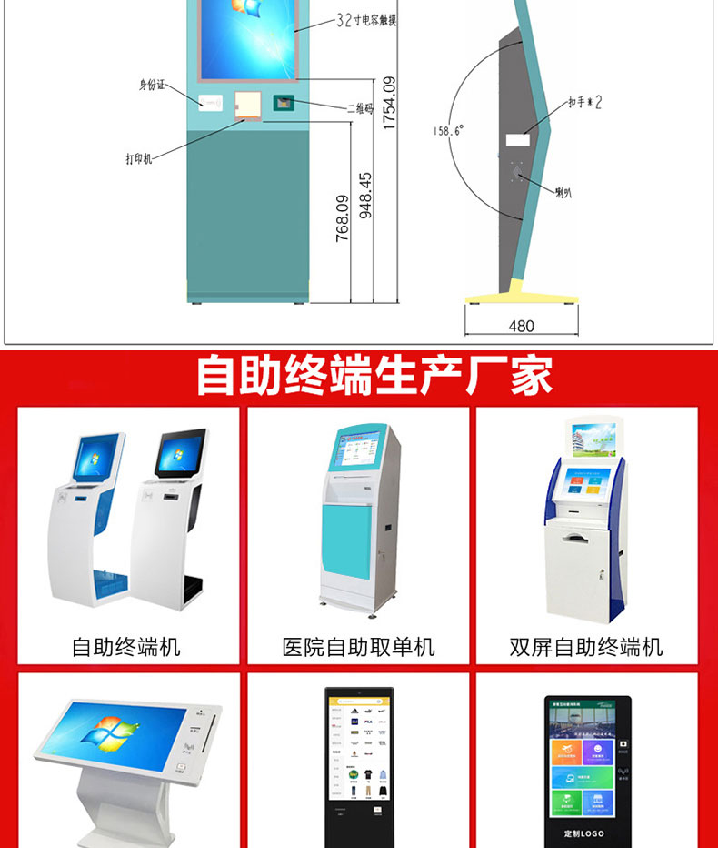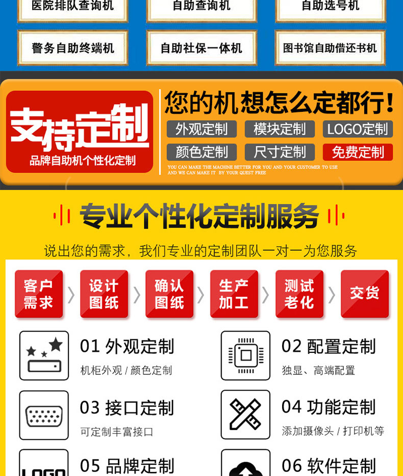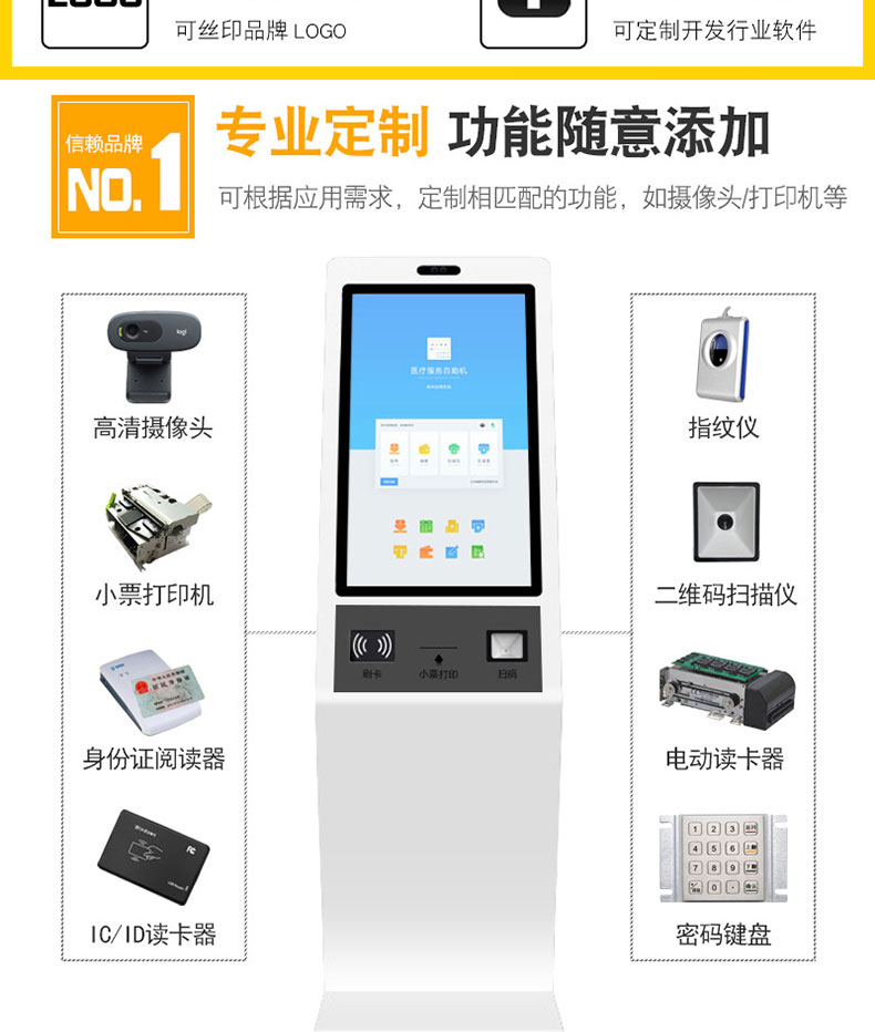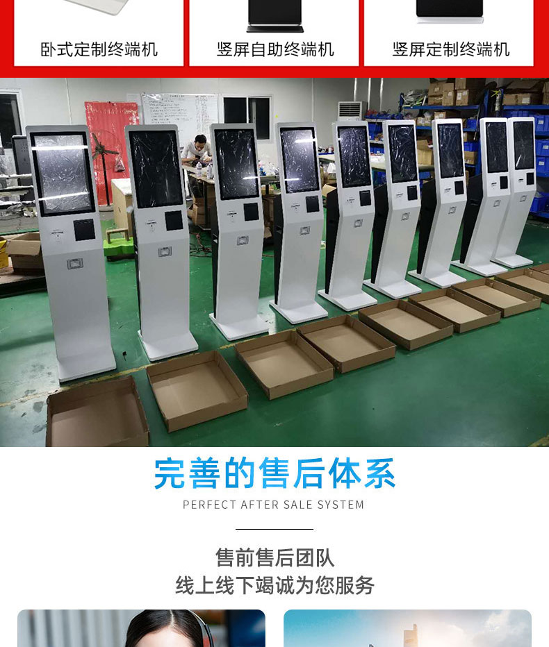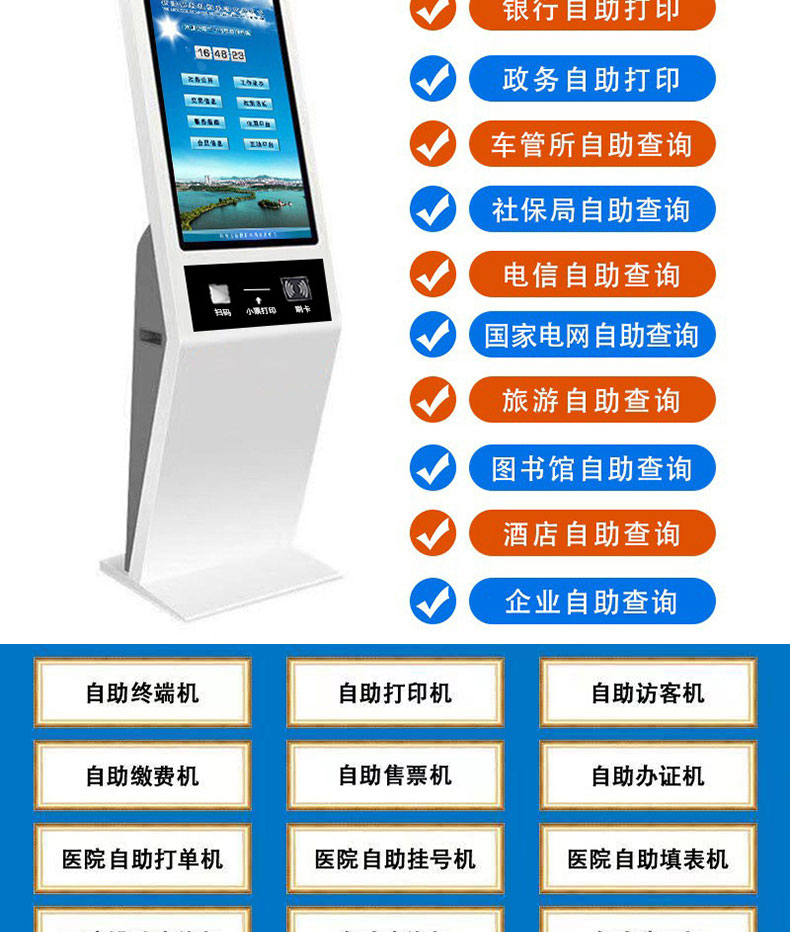 自助終端機定制:定制各種場景各種款式非標終端機;例如訪客機、景區自助取票機、醫院繳費查詢機、醫院自助取單機、社保查詢機、室內外廣告機、排隊叫號機、工控一體機、電力繳費查詢機、圖書自助銷售機、便攜式計算機、酒店自助入住機、自助收銀機等終端。