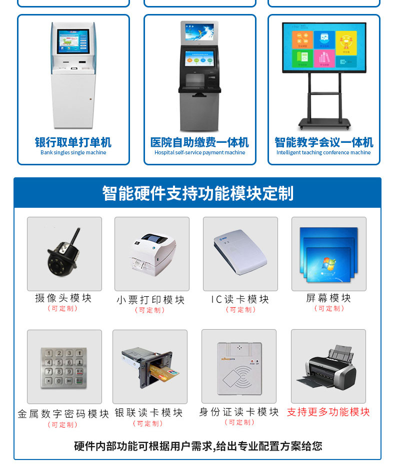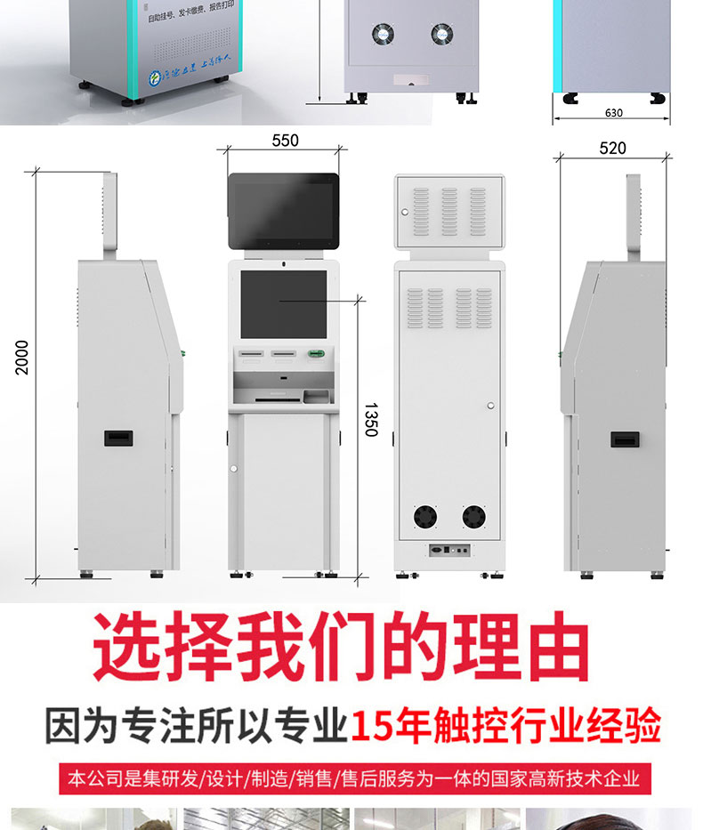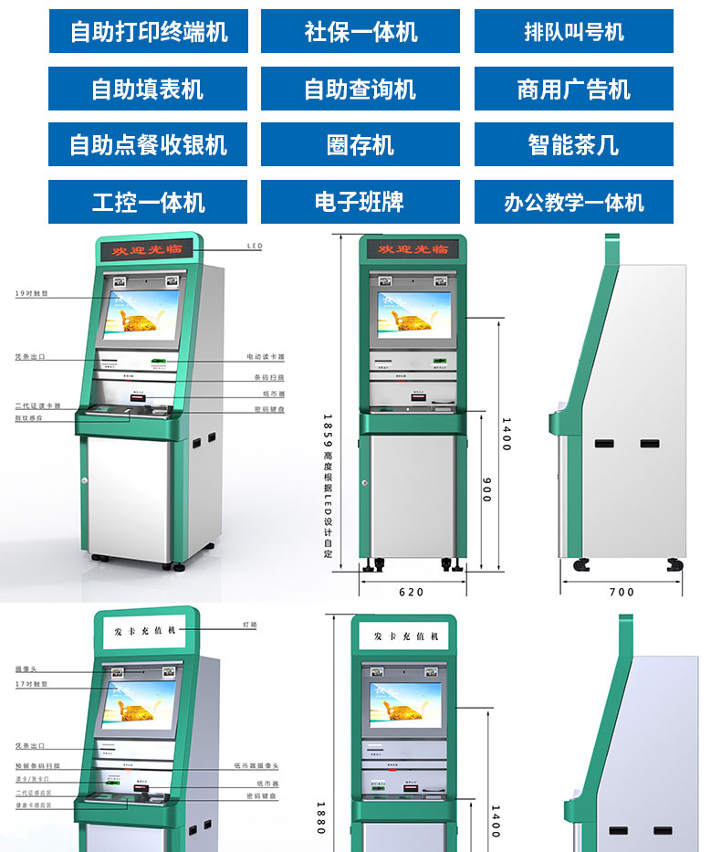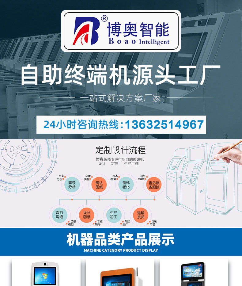 專業(yè)提供電腦觸控產(chǎn)品、自助服務(wù)終端的設(shè)計及生產(chǎn)服務(wù),主要產(chǎn)品自助終端機、自助打印機、自助取票機、自助查詢機、自助繳費機、自助發(fā)卡機、自助政務(wù)一體機,產(chǎn)品使用于各個行業(yè);醫(yī)院、學(xué)校、銀行、酒店、景區(qū)等。。。。。公司擁有專業(yè)的生產(chǎn)線,嚴(yán)格的質(zhì)量把控。耐心的咨詢服務(wù)團隊及專業(yè)的技術(shù)負(fù)責(zé)團體。