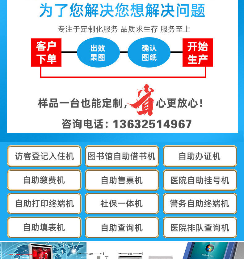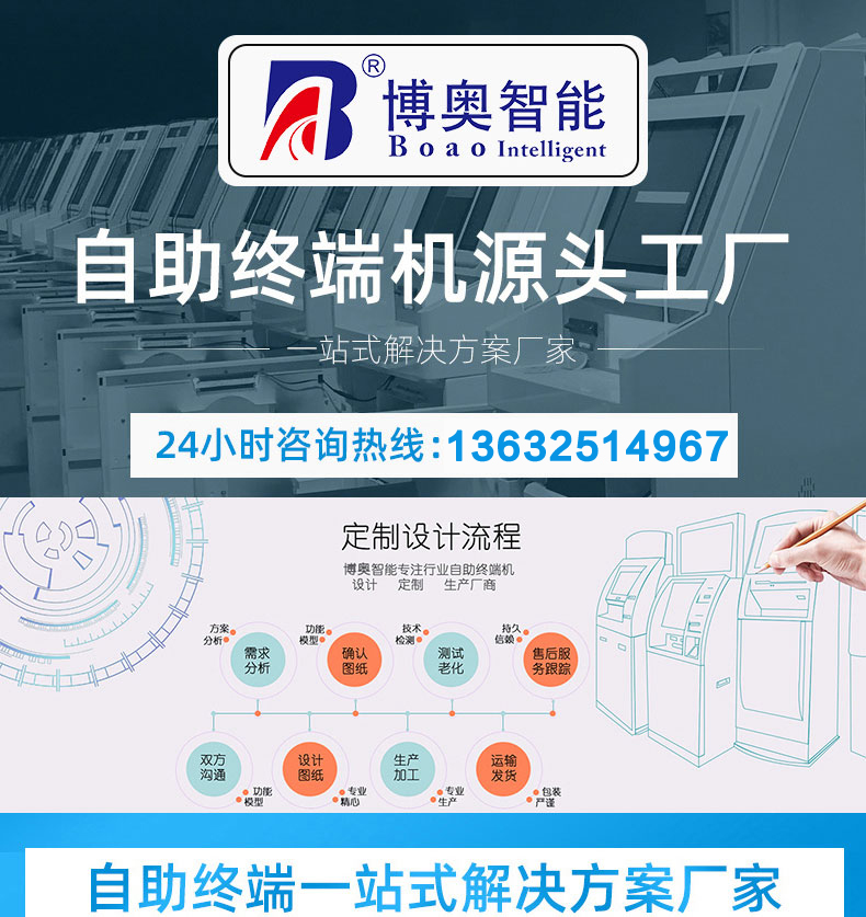 深圳市博奧智能科技有限公司專業提供自助終端機、觸摸查詢一體機、廣告機、液晶顯示器等產品的硬件、軟件研發與設計加工OEM/ODM等一站式服務;我們一直秉承以產品質量為核心、客戶至上、服務共贏為宗旨,為金融、醫療、教育、人工智能、政府工程項目、智慧城市、軌道交通、商業自助服務、廣告傳媒等行業提供質量過硬的產品和優質的服務。