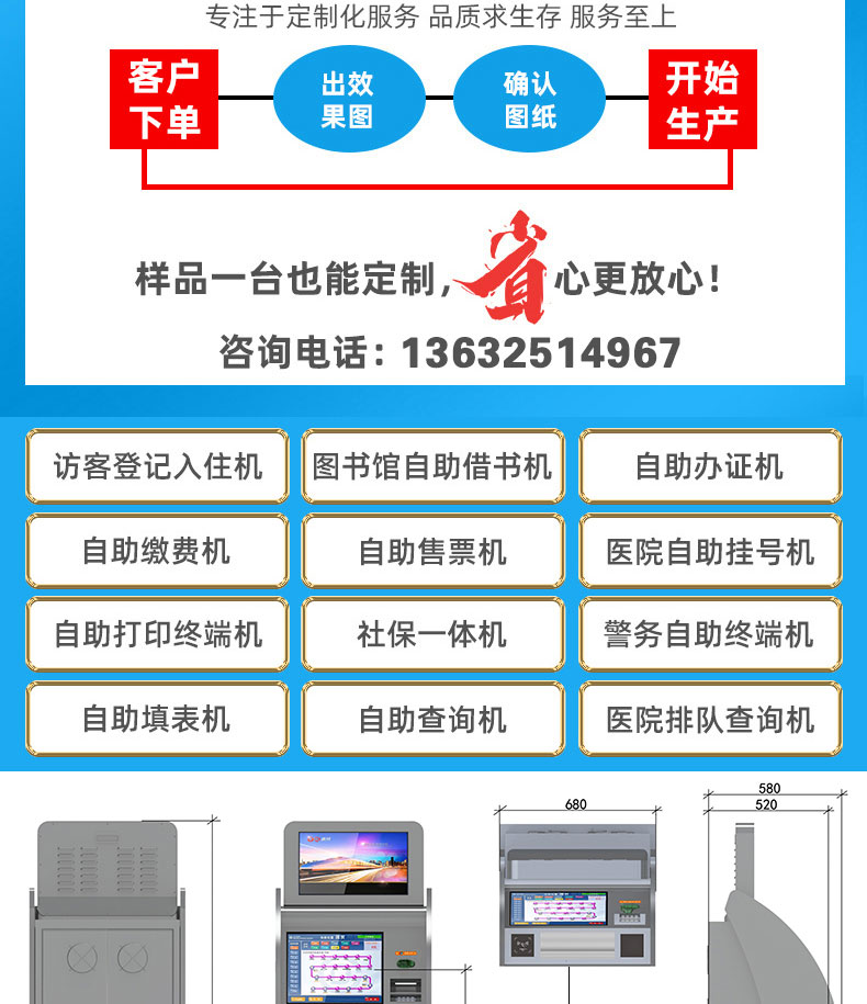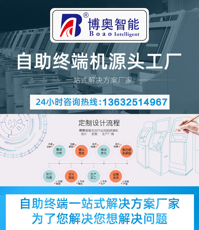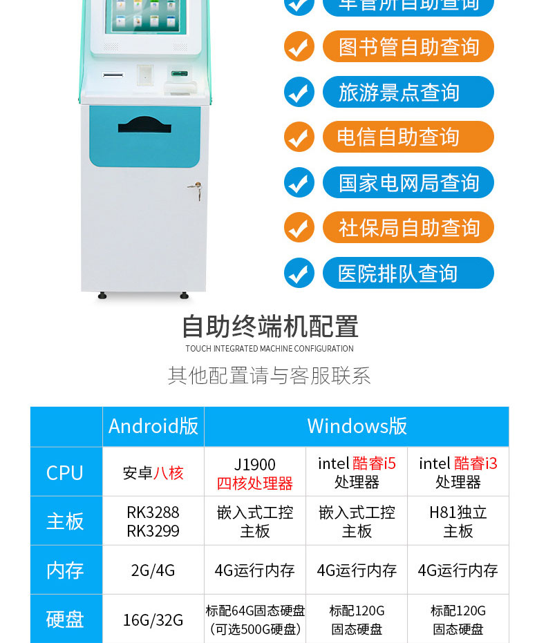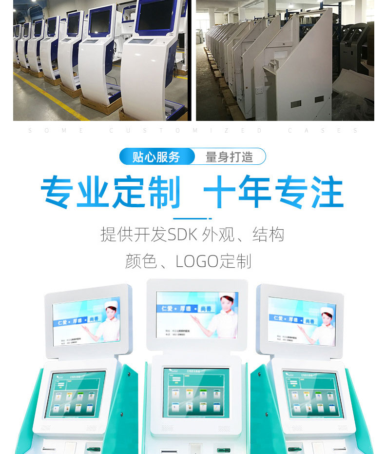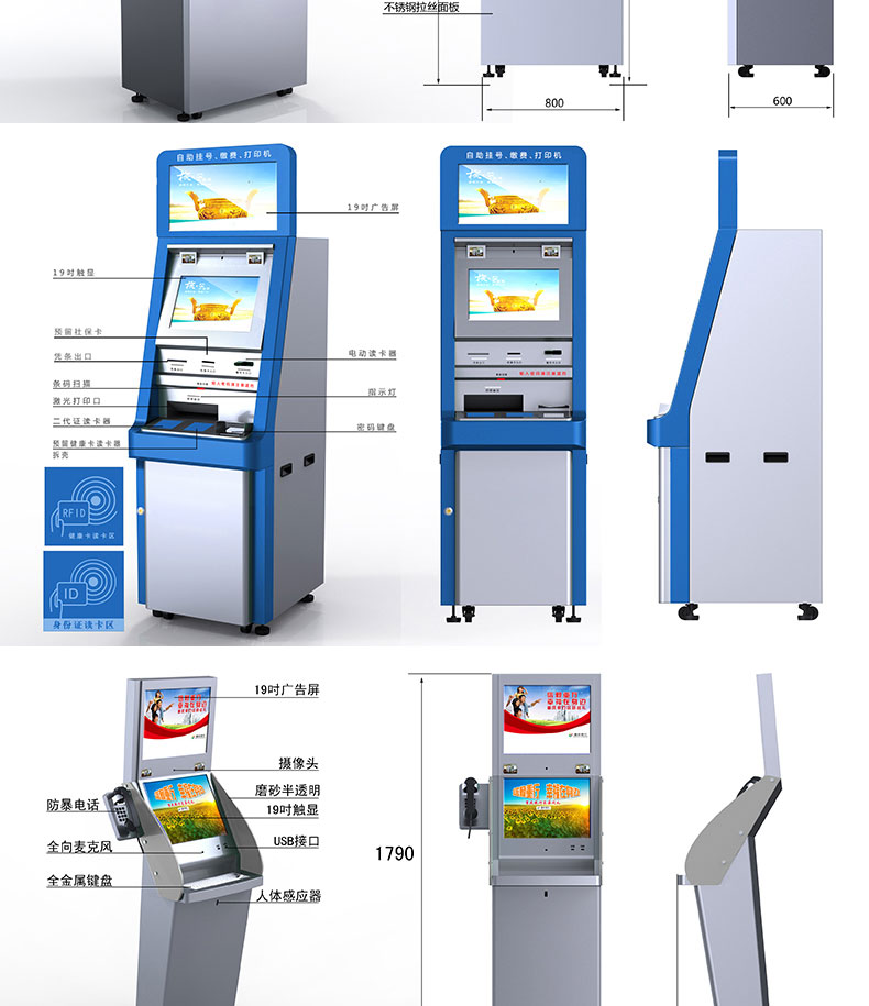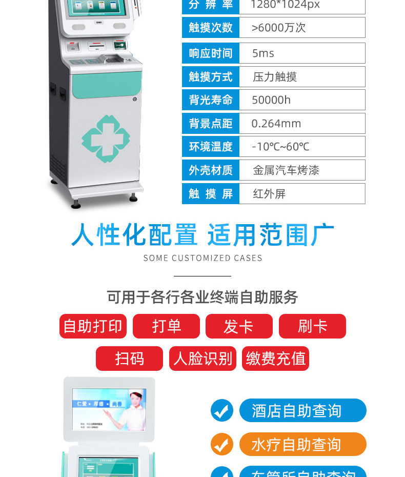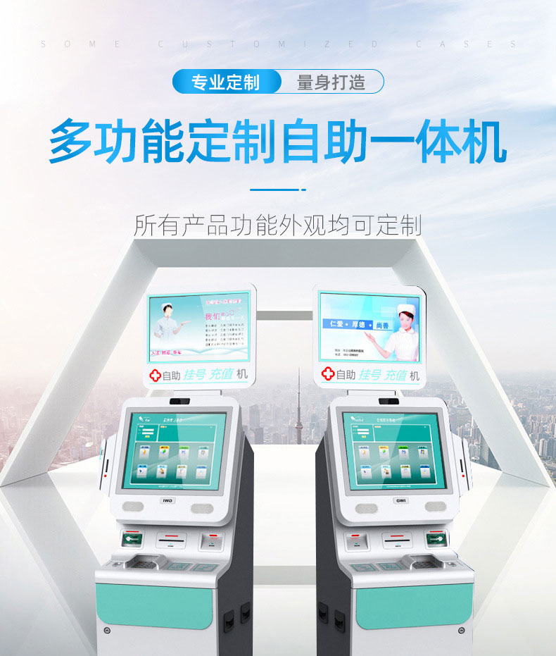 自助終端機定制:定制各種場景各種款式非標終端機;例如訪客機、景區自助取票機、醫院繳費查詢機、醫院自助取單機、社保查詢機、室內外廣告機、排隊叫號機、工控一體機、電力繳費查詢機、圖書自助銷售機、便攜式計算機、酒店自助入住機、自助收銀機等終端。