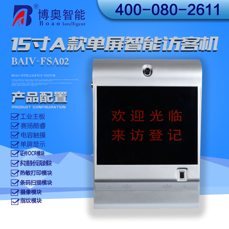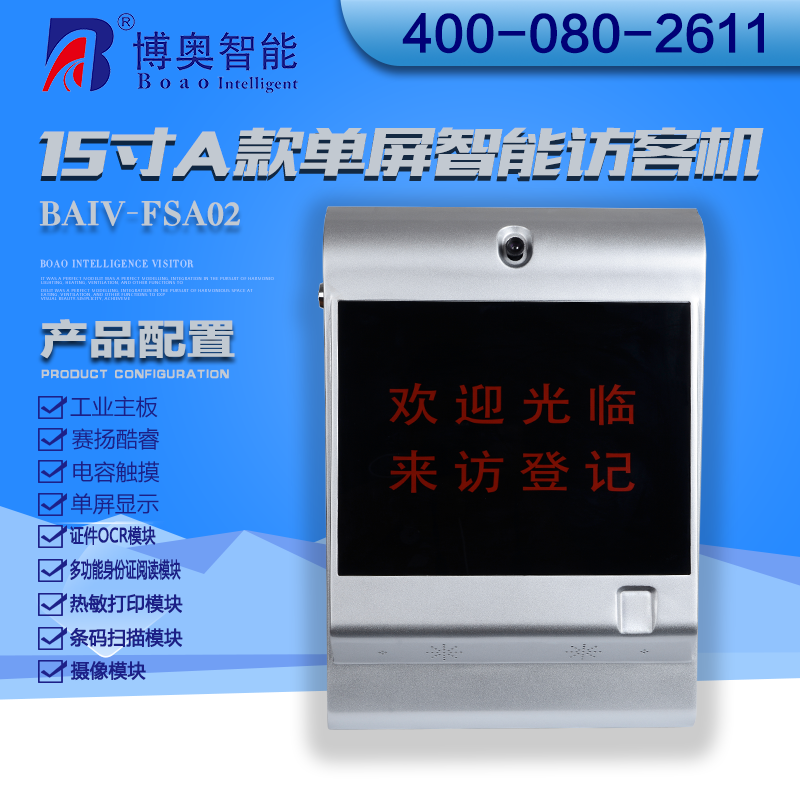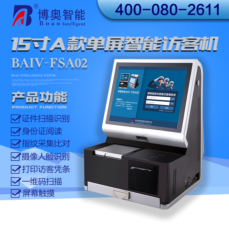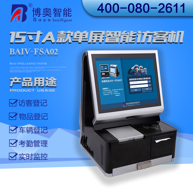 ? ? ? ?15寸A款雙屏智能訪客機是博奧智能自主開發,采用人體工程學與模塊化設計相結合,選用鈑金材料、洗車烤漆工藝加工出來的一款訪客管理終端,訪客管理終端內部裝有WIN7操作系統SQL Server數據庫及我公司自主開發的訪客登記管理系統等主要軟件,從而匯集成了一套完善的智能訪客登記管理系統,它具有外觀精美,功能完善,操作方便等特點。