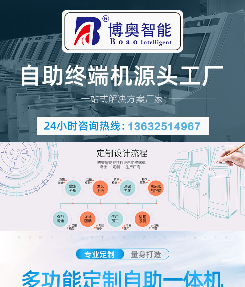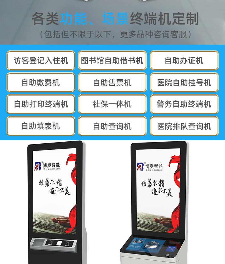 深圳市博奧智能科技有限公司專業提供自助終端機、觸摸查詢一體機、廣告機、液晶顯示器等產品的硬件、軟件研發與設計加工OEM/ODM等一站式服務;我們一直秉承以產品質量為核心、客戶至上、服務共贏為宗旨,為金融、醫療、教育、人工智能、政府工程項目、智慧城市、軌道交通、商業自助服務、廣告傳媒等行業提供質量過硬的產品和優質的服務。