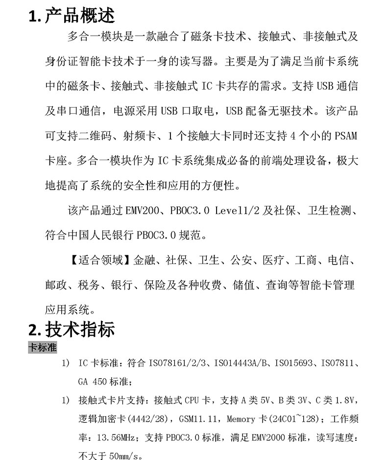 多合一模塊是一款融合了磁條卡技術、接觸式、非接觸式及身份證智能卡技術于一身的讀寫器。主要是為了滿足當前卡系統中的磁條卡、接觸式、非接觸式 IC 卡共存的需求。支持 USB 通信及串口通信,電源采用 USB 口取電,USB 配備無驅技術。該產品可支持二維碼、射頻卡、1 個接觸大卡同時還支持 4 個小的 PSAM 卡座。多合一模塊作為 IC 卡系統集成必備的前端處理設備,極大地提高了系統的安全性和應用的方便性。 該產品通過 EMV200PBOC3.0 Level1/2 及社保、衛生檢測、符合中國人民銀行 PBOC3.0 規范。