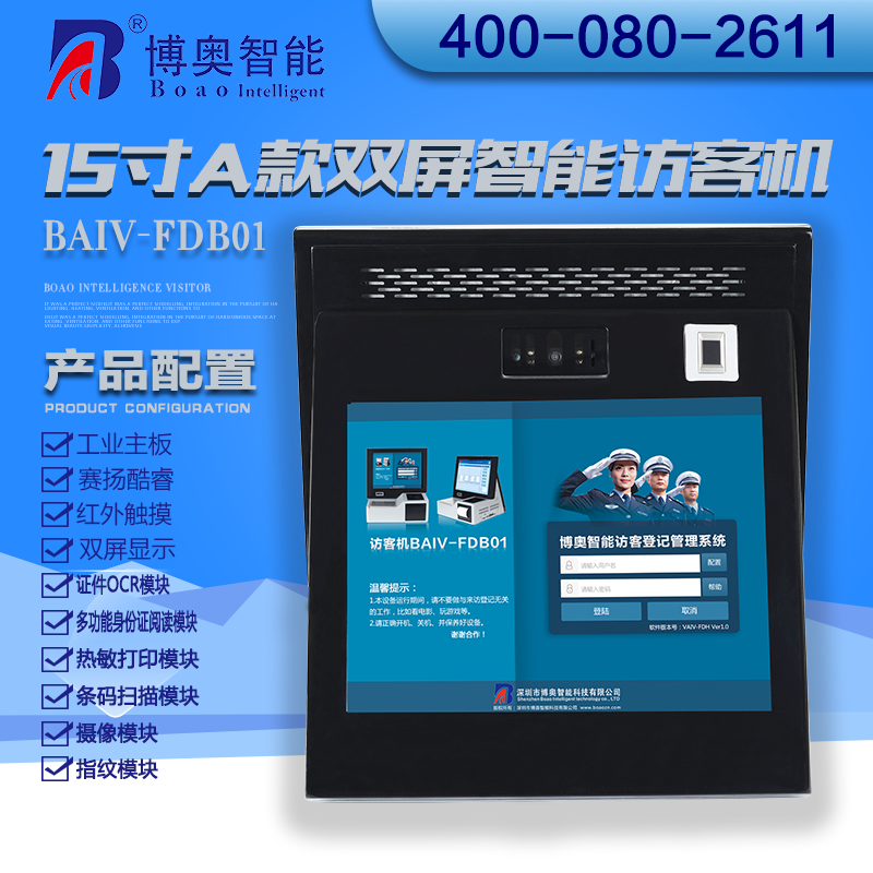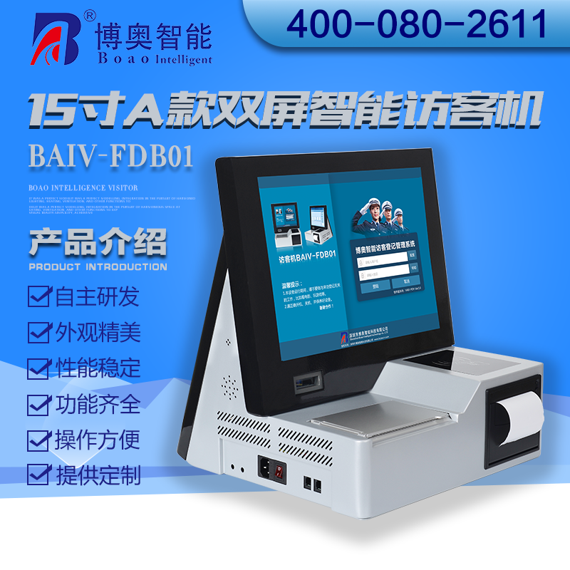 ? ? ? 15寸B款雙屏智能訪客機(jī)是博奧智能自主開發(fā),采用人體工程學(xué)與模塊化設(shè)計(jì)相結(jié)合,融合計(jì)算機(jī)、觸摸屏手寫、證件識(shí)別(OCR),射頻識(shí)別、指紋生物識(shí)別、熱敏打印、條碼、數(shù)碼攝像、自動(dòng)制證、硬件加密、網(wǎng)絡(luò)等技術(shù);選用鈑金材料、表面噴粉工藝加工出來的一款訪客管理終端,訪客管理終端內(nèi)部裝有WIN7操作系統(tǒng)SQL Server數(shù)據(jù)庫(kù)及我公司自主開發(fā)的訪客登記管理軟件等主要軟件,從而匯集成了一套完善的智能訪客登記管理系統(tǒng),它具有外觀精美,功能完善,操作方便等特點(diǎn)。