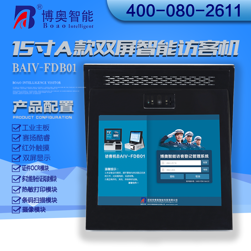 ? ? ? ?15寸B款雙屏智能訪客機(jī)主要用在政府機(jī)關(guān)、關(guān)口、機(jī)場(chǎng)、軍隊(duì)、公安、法院、學(xué)校、事業(yè)單位、花園小區(qū)、高檔寫字樓、工廠等門衛(wèi)傳達(dá)室用來訪客登記管理。