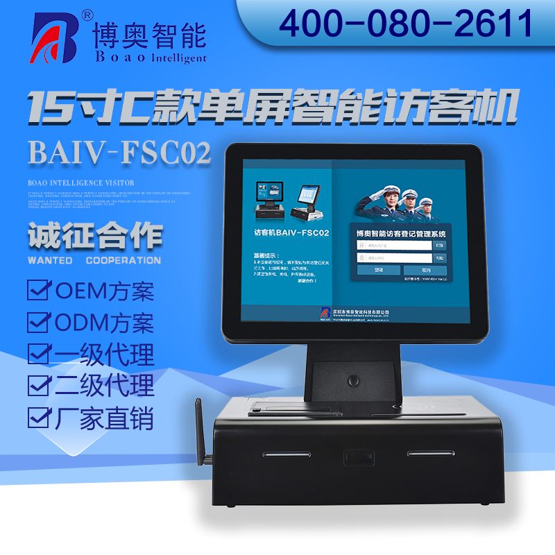 ? ? ? 15寸C款單屏智能訪客機控制核芯是博奧智能自主研發的工控主板,達到工業級要求