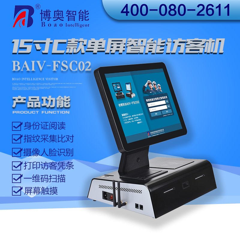 ? ? ? 15寸C款單屏智能訪客機內部采用金屬支架和塑料外殼相結合,這樣既保證了產品的牢固性,又突顯出外觀的精致;設備集成了工控主板、液晶屏、電容觸摸屏、多功能身份證閱讀模塊(讀寫IC卡)、指紋模塊、攝像模塊、熱敏打印模塊、條碼掃描模塊等主要部件。為了保證設備的實用性,能夠實現一機多用的功能,在設計時我們利用人體工程學和模塊化設計相結合,比如前屏幕可以手動調節可視角度,攝像模塊自動補光自動調焦,手動調節上下高度,根據使用場景和功能要求,集成模塊可以自由選配等。所謂一機多用是指設備不但能在政府機關、軍隊、公安、法院、學校、事業單位、花園小區、高檔寫字樓、工廠等門衛或者傳達室做為訪客機登記設備使用,同是又能在辦事大廳、營業大廳、醫院掛號等場所用做辦事設備機用,比如現在有很多辦事大廳所用的計算機、身份證閱讀器、指紋采集儀、攝像頭等辦公設備都是采用分體式的,這樣不但操作不方便而且使整個工作臺面顯得零亂,影響辦事大廳形象;針對這些問題我公司開發了這款一體機設備,這款設備所采用的身份證閱讀模塊是多功能身份證閱讀模塊(內置公安部授權指定身份證專用模組),支持ISO/IEC7816-1/2/3接觸式CPU卡、ISO/IEC 14443-A/B/C 非接觸式卡片、ISO/IEC 7811 磁條卡、身份證卡?;支持4個PSAM卡安全卡槽、支持高速PSAM卡安全交易認證?;設備前端留有兩個插卡擴展口,即裝即用,比如銀行卡、社保卡等,非接觸方式可以對IC卡進讀寫操作,可以讀取身份證信息(芯片內的圖片、文字、指紋等信息),另外采用的攝像頭模塊硬件像素500萬,自動補光,自動調焦,手動調節上下拍照高度,完全符合人臉識別要求。