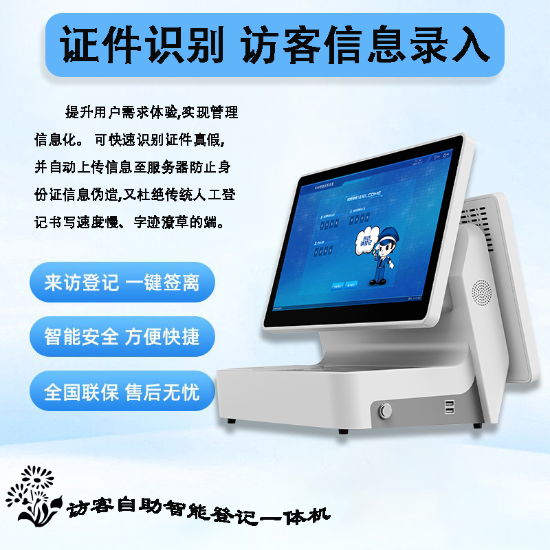 雙屏設計**:這種設備通常有一個主屏幕和一個副屏幕。主屏幕用于顯示訪客登記界面,供訪客進行操作,而副屏幕可以顯示其他信息,如企業宣傳、安全提示或與主屏幕同步的登記信息,以提供更好的用戶體驗。