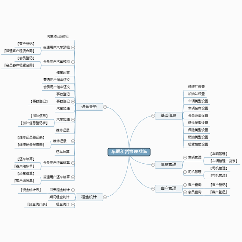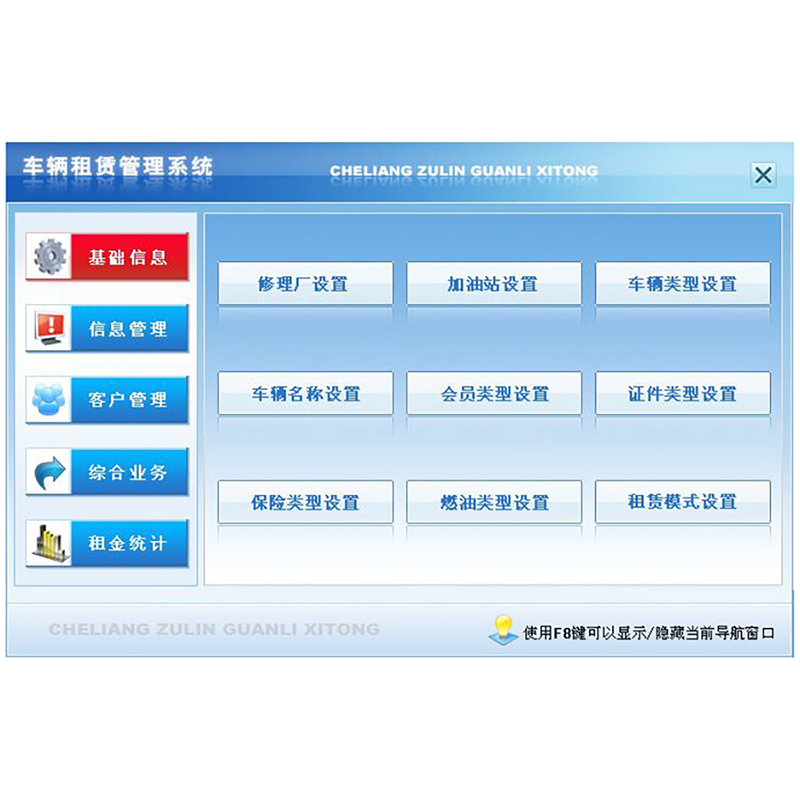 基本信息:修理廠設(shè)置、加油站設(shè)置、車輛類型設(shè)置、車輛名稱設(shè)置、會(huì)員類型設(shè)置、證件類型設(shè)置、保險(xiǎn)類型設(shè)置、燃油類型設(shè)置、租賃模式設(shè)置;