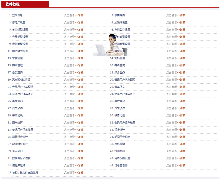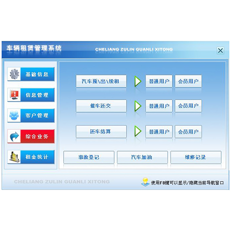 綜合業(yè)務(wù):汽車預(yù)出續(xù)租、催車還交、事故登記、汽車加油、維修記錄、還車結(jié)算;
