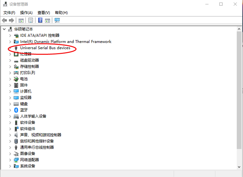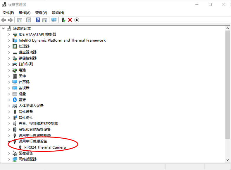Micro USB 2.0數據線連接電腦和R1相機后,打開“設備管理器”,找到“Universal Serial Bus devices”或者“通用串行總線”中的感嘆號設備“PIR324 Thermal Camera
