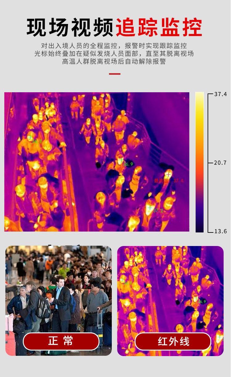 紅外熱成像儀是一款高精度的熱成像,可以實時在線測量目標物體的溫度,輸出熱像視頻,查看超溫狀況。搭配不同配套的平臺軟件,適應人體測溫篩查,本文檔介紹針對人體測溫篩查使用方式。