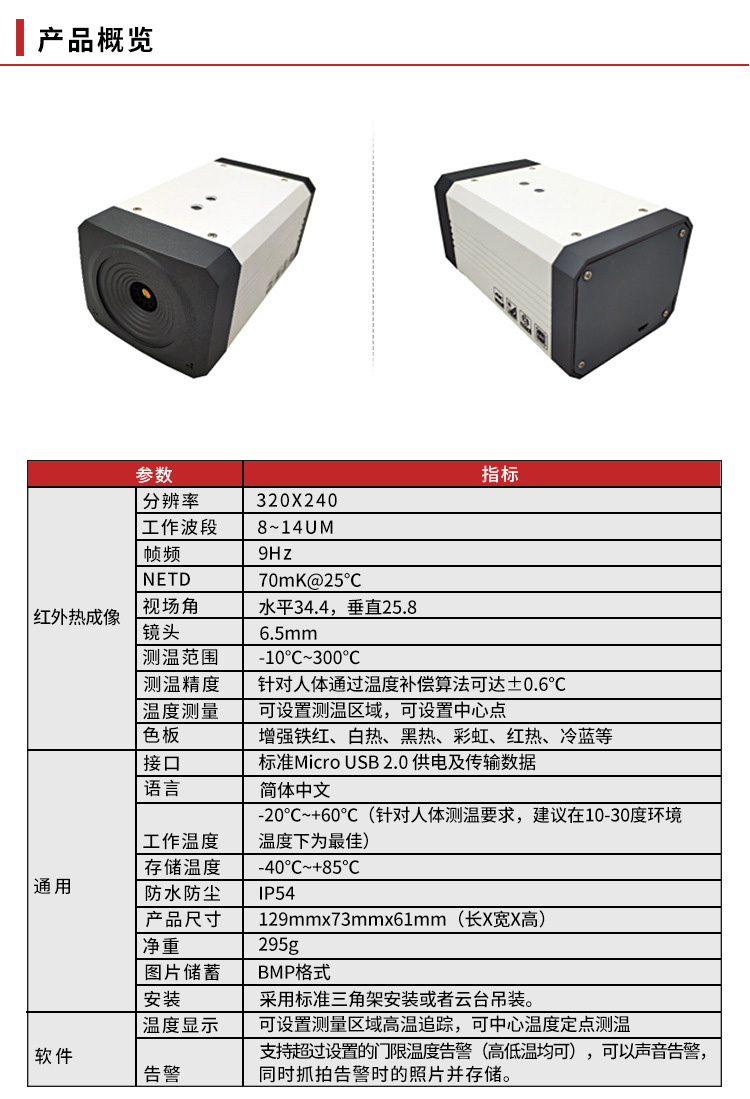 測溫儀采用USB一線安裝的方式,將供電和數據傳輸,通過一條USB線路完成,可便利的達到快速部署。可由客戶在部署現場,根據環境的變化自行進行溫度補償,無需黑體進行不斷校準,而能保證誤差精度在±0.5℃范圍內。