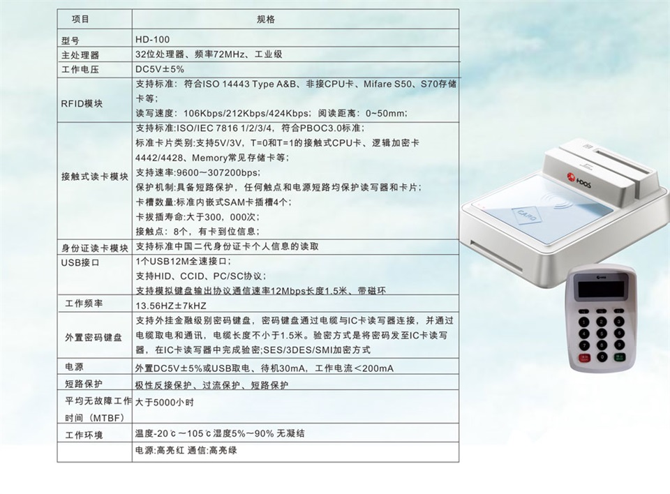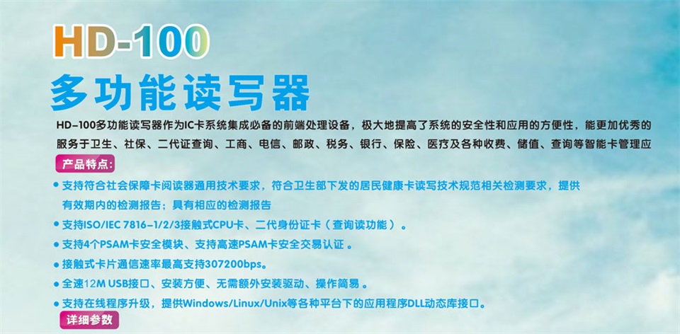 產品采用 RFID技術,可支持社保卡、二代證、一代證的讀取和寫入;支持金融 IC卡讀寫;支持銀聯在線支付;可用于身份識別和驗證;可應用于金融領域、交通領域、社保領域、一卡通領域等。